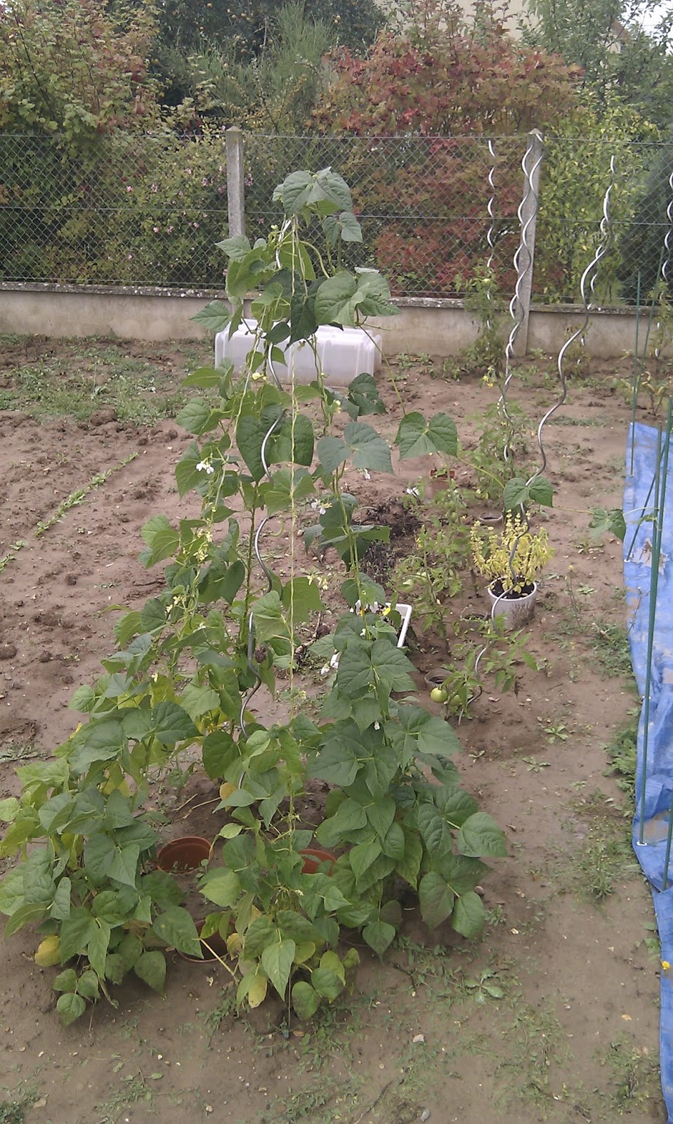 Par contre comme tuteur central, j'ai utilisé un de mes tuteur à tomate. Il va falloir prévoir plus grand, un tuteur de 2m50 ne sera pas trop grand car actuellement j'ai mesuré près de 2m50 de rame.